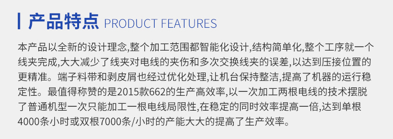 LL-662全數字智能雙端壓著(zhù)機 產(chǎn)品說(shuō)明: 本產(chǎn)品以全新的設計理念,整個(gè)加工范圍都智能化設計,結構簡(jiǎn)單化,整個(gè)工序就一個(gè)線(xiàn)夾完成,大大減少了線(xiàn)夾對電線(xiàn)的夾傷和多次交換線(xiàn)夾的誤差,以達到接壓位置的更精準。端子料帶和剝皮屑也經(jīng)過(guò)...