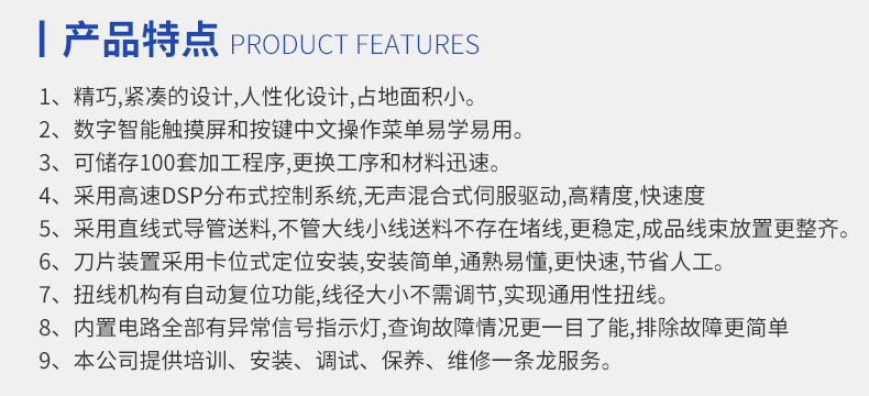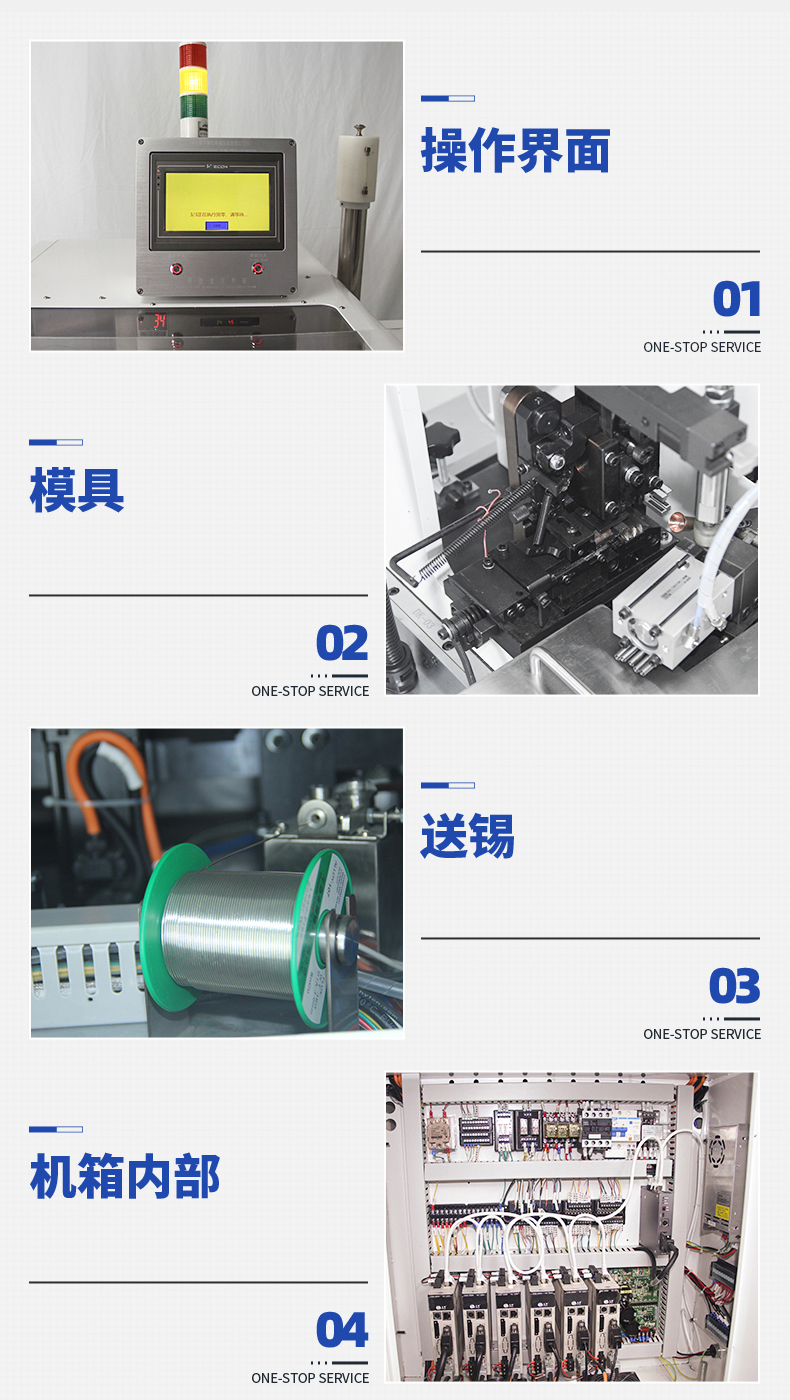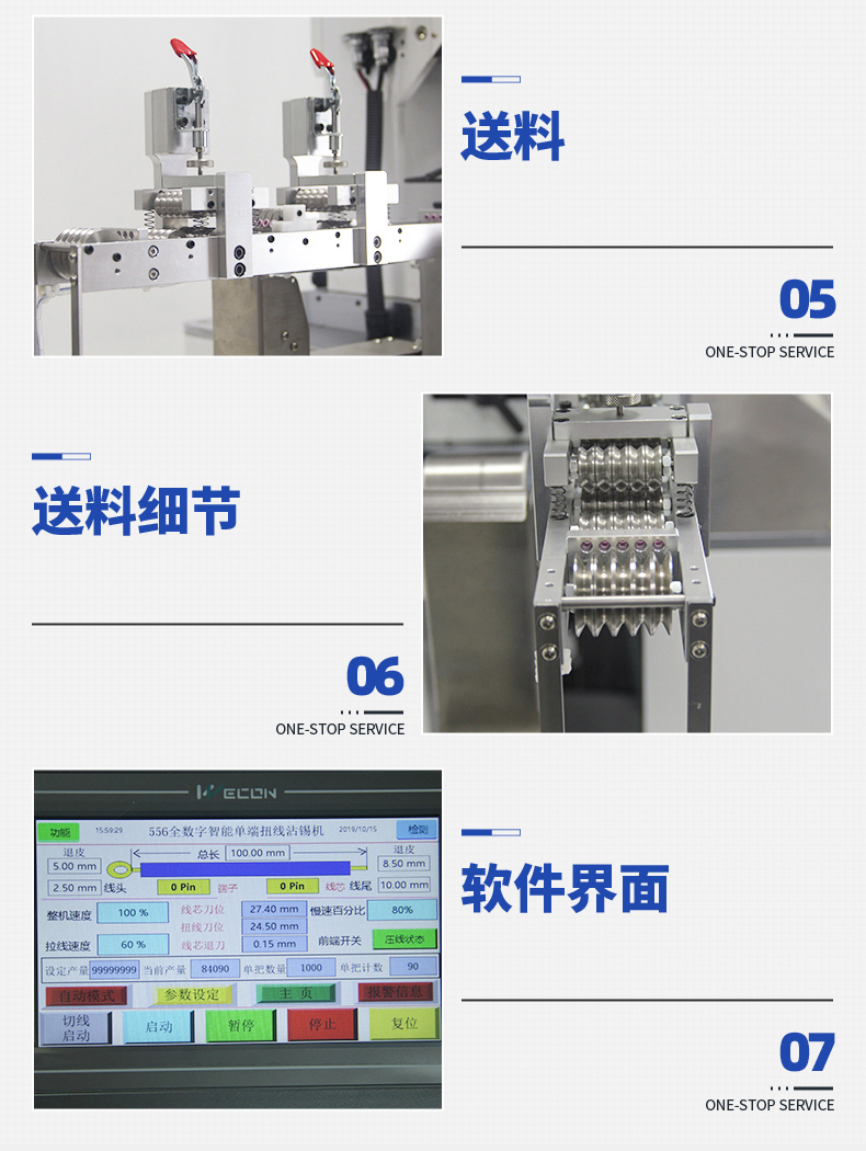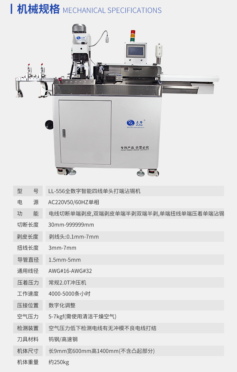 LL-556全數字智能五線(xiàn)單頭打端沾錫機 產(chǎn)品說(shuō)明: 1.精巧,緊湊的設計,極佳人性化設計,占地面積小。 2.數字智能觸摸屏和按鍵中文操作菜單易學(xué)易用。 3.可儲存100套加工程序,更換工序和材料迅速。 ...