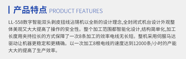 LL-558數字智能雙頭剝皮扭線(xiàn)沾錫機以全新的設計理念,全封閉式機臺設計外觀(guān)整體美觀(guān)又大大提高了操作的安全性。整個(gè)加工范圍都智能化設計,結構簡(jiǎn)單化,加工長(cháng)度用夾持拉長(cháng)的方式保證了一次8條加工的效率電線(xiàn)無(wú)長(cháng)短。整機采用伺服馬達驅動(dòng)讓機器更穩定和更精確。以一次加工8跟電線(xiàn)的速度達到12000條/小時(shí)的產(chǎn)能大大提高了生產(chǎn)效率。