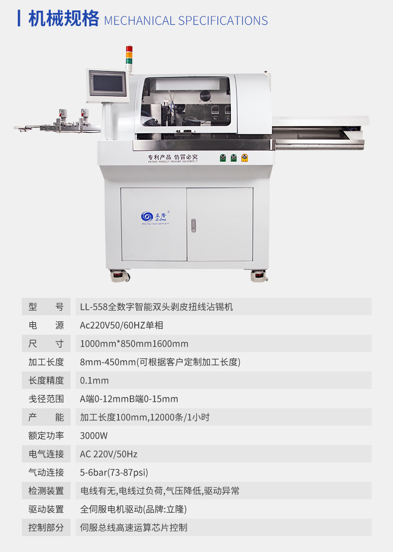 LL-558全數字智能雙頭剝皮扭線(xiàn)沾錫機   產(chǎn)品說(shuō)明:   LL-558數字智能雙頭剝皮扭線(xiàn)沾錫機以全新的設計理念,全封閉式機臺設計外觀(guān)整體美觀(guān)又大大提高了操作的安全性。整個(gè)加工范圍都智能化設計,結構簡(jiǎn)單化,加工長(cháng)度用夾持拉長(cháng)的方式...